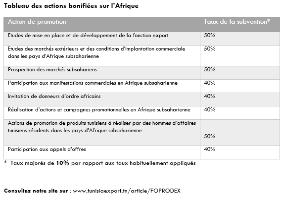 Bien qu’il s’agisse d’une mesure appliquée depuis longue date, le bonus de 10% accordé aux taux de subventions du Foprodex dont bénéficient les PME exportatrices au titre d’actions promotionnelles qui s’opèrent sur les marchés de l’Afrique subsaharienne, sera d’un apport considérable particulièrement en cette période de multiplication des actions à caractère promotionnel sur l’Afrique. Cette discrimination positive en faveur des pays de l’Afrique subsaharienne fut décrétée dans le but d’encourager les PME tunisiennes à conquérir les destinations peu familières et lointaines et à mettre en application la politique de diversification des marchés que nous nous efforçons à consolider.